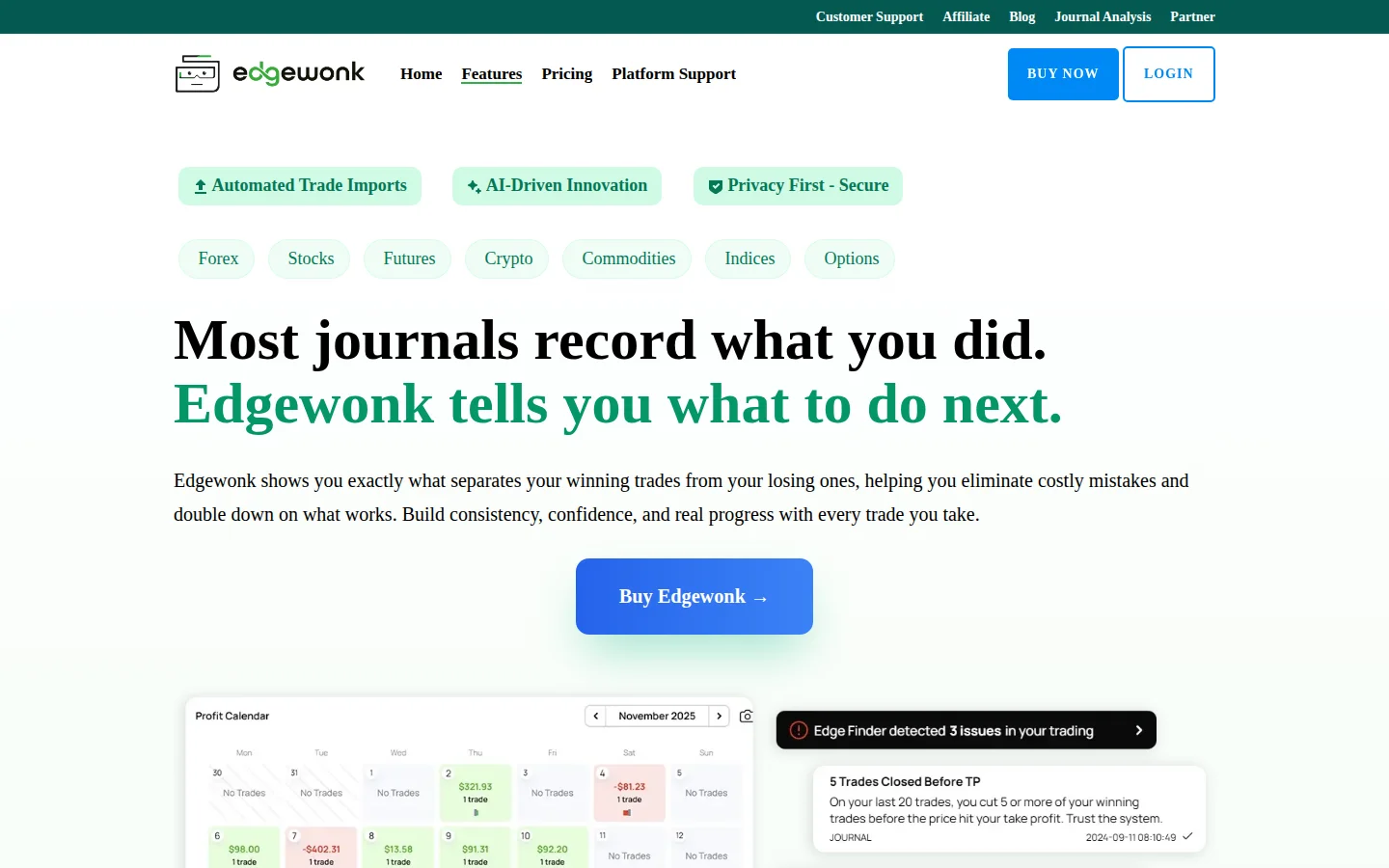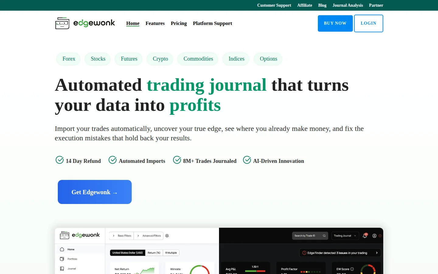 Data-driven trading journal focused on finding your edge through detailed trade analytics and psychology tracking.