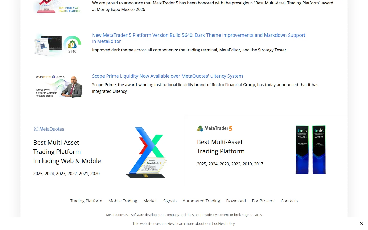 The platform is free for traders. MetaQuotes makes its money by licensing MT5 to brokers, who then offer it to their clients. This business model means you never pay MetaQuotes directly — your broker provides MT5 access as part of your trading account. As of 2026, hundreds of brokers worldwide offer MT5, and trading volume on the platform has surpassed MT4, marking a decisive shift in the industry. MT5 has won "Best Multi-Asset Trading Platform" at the Finance Magnates London Summit every year from 2017 to 2025.