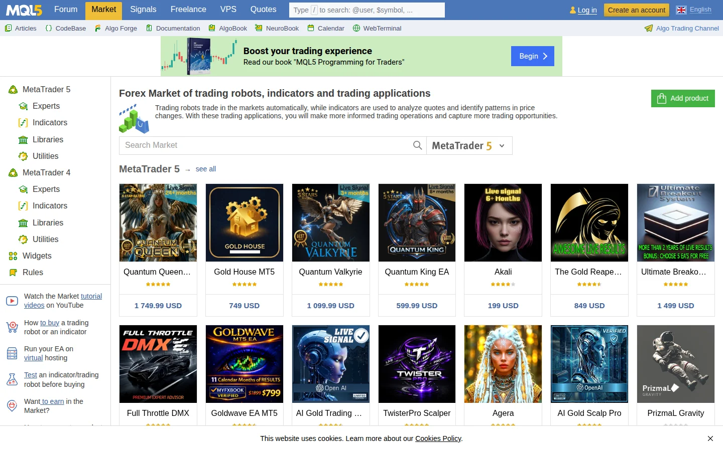 The MQL5 Market is an app store for trading tools — thousands of Expert Advisors, indicators, and utilities ranging from free contributions to commercial EAs at $200-$1,750+. You can test any product in the Strategy Tester before buying. The broader MQL5 community (mql5.com) adds a free code library, a freelance section for hiring custom developers, a trading signals service, and VPS hosting for running EAs 24/7.