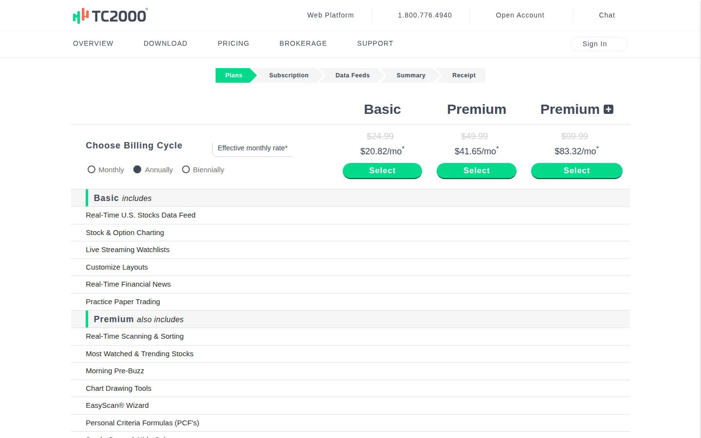 The hidden cost: Real-time streaming data is not included in any plan. You need to add exchange data feeds at $14.99 to $34.97 per month depending on which exchanges you want. For an active trader who needs real-time NYSE and NASDAQ data, your actual monthly cost on the Premium plan is closer to $75 to $85, not $49.99. This is the single biggest pricing complaint from TC2000 users and it is a legitimate gripe.